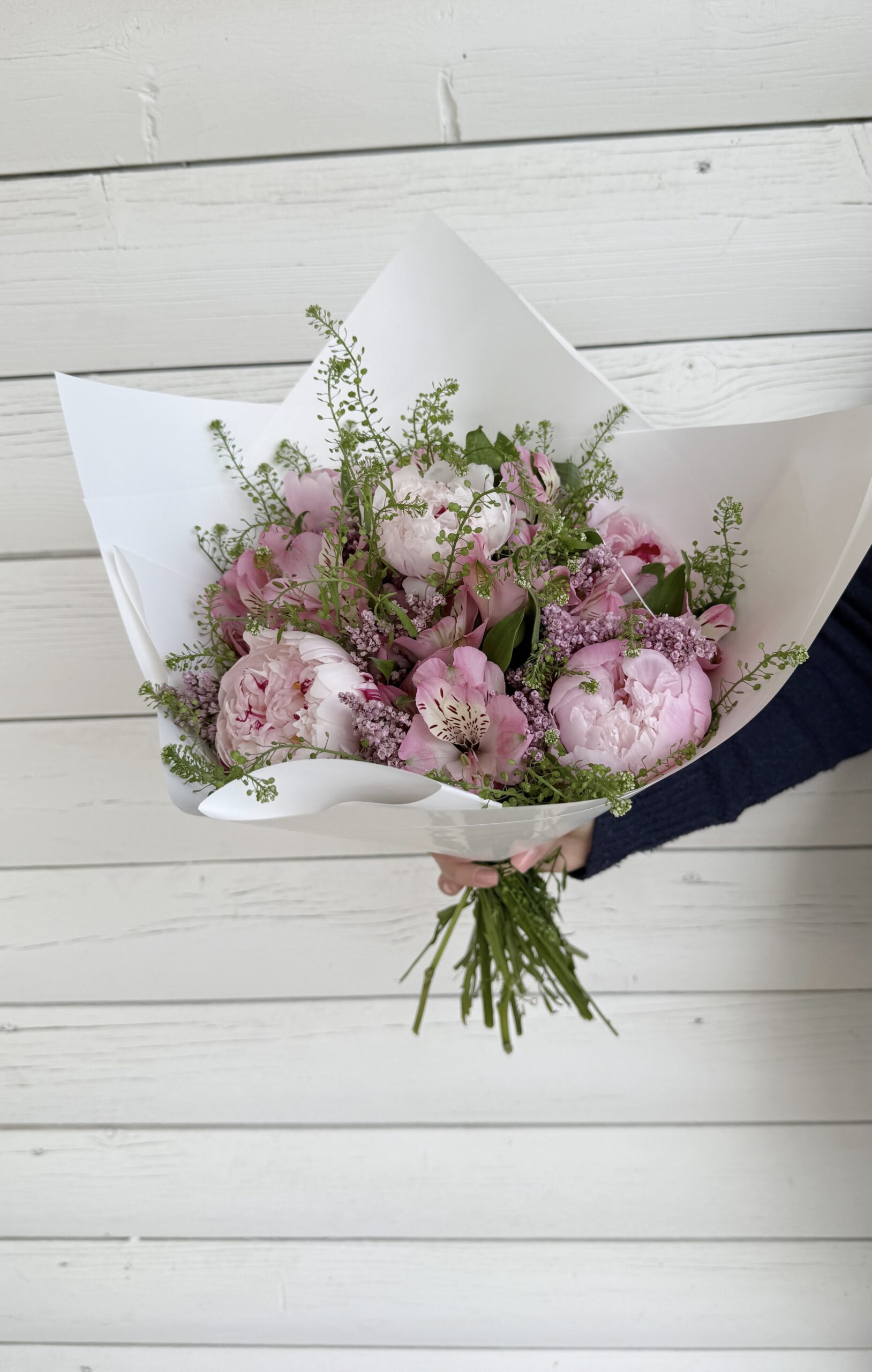 זר בעיצוב אלגנטי ומאופק, הנשען על גווני בלוש רכים ושילוב מדויק של פרחים וירק עדין.