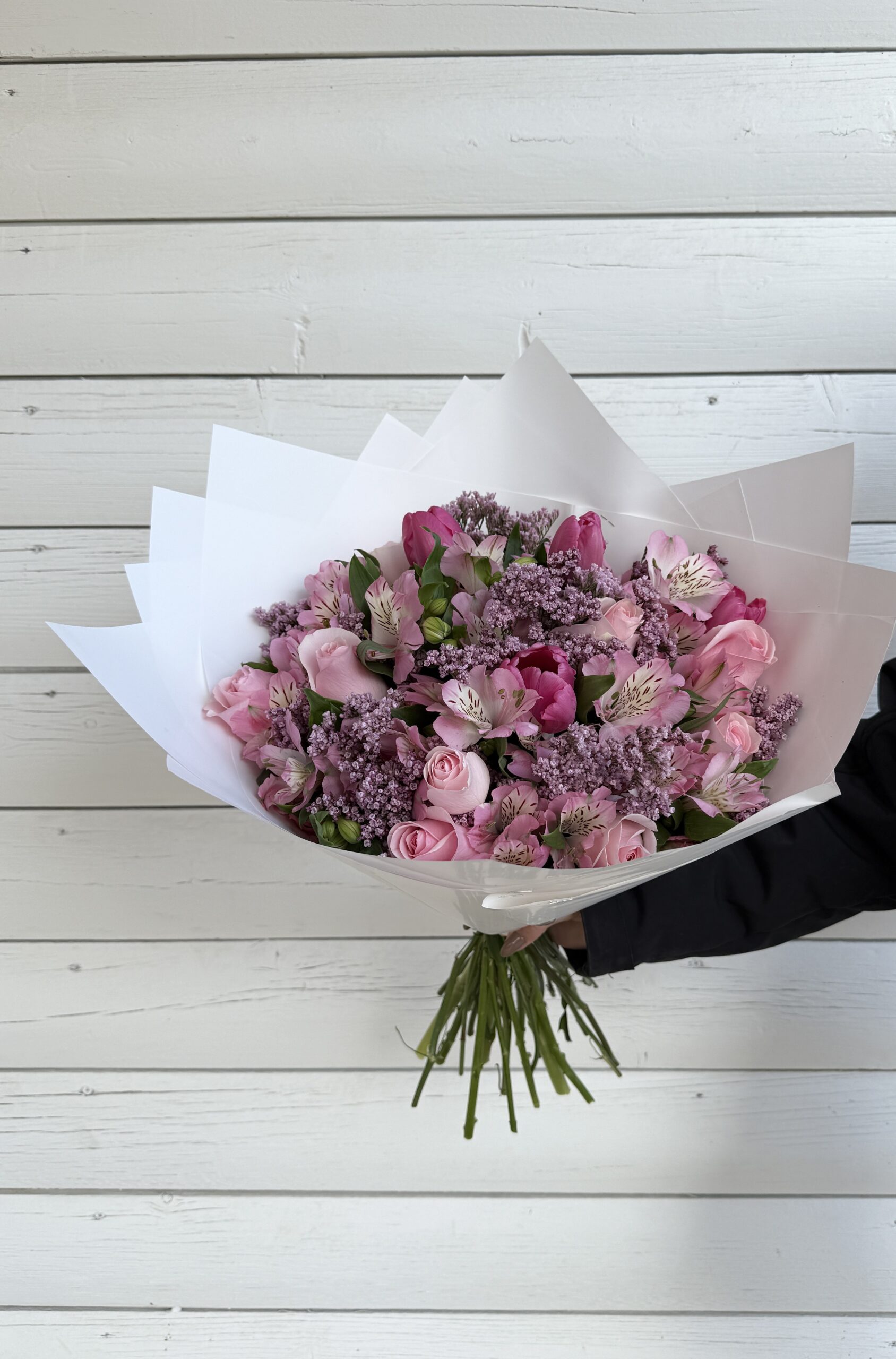 זר בעיצוב רך ומאוזן, שמשלב גווני ורוד ועדינות טבעית.