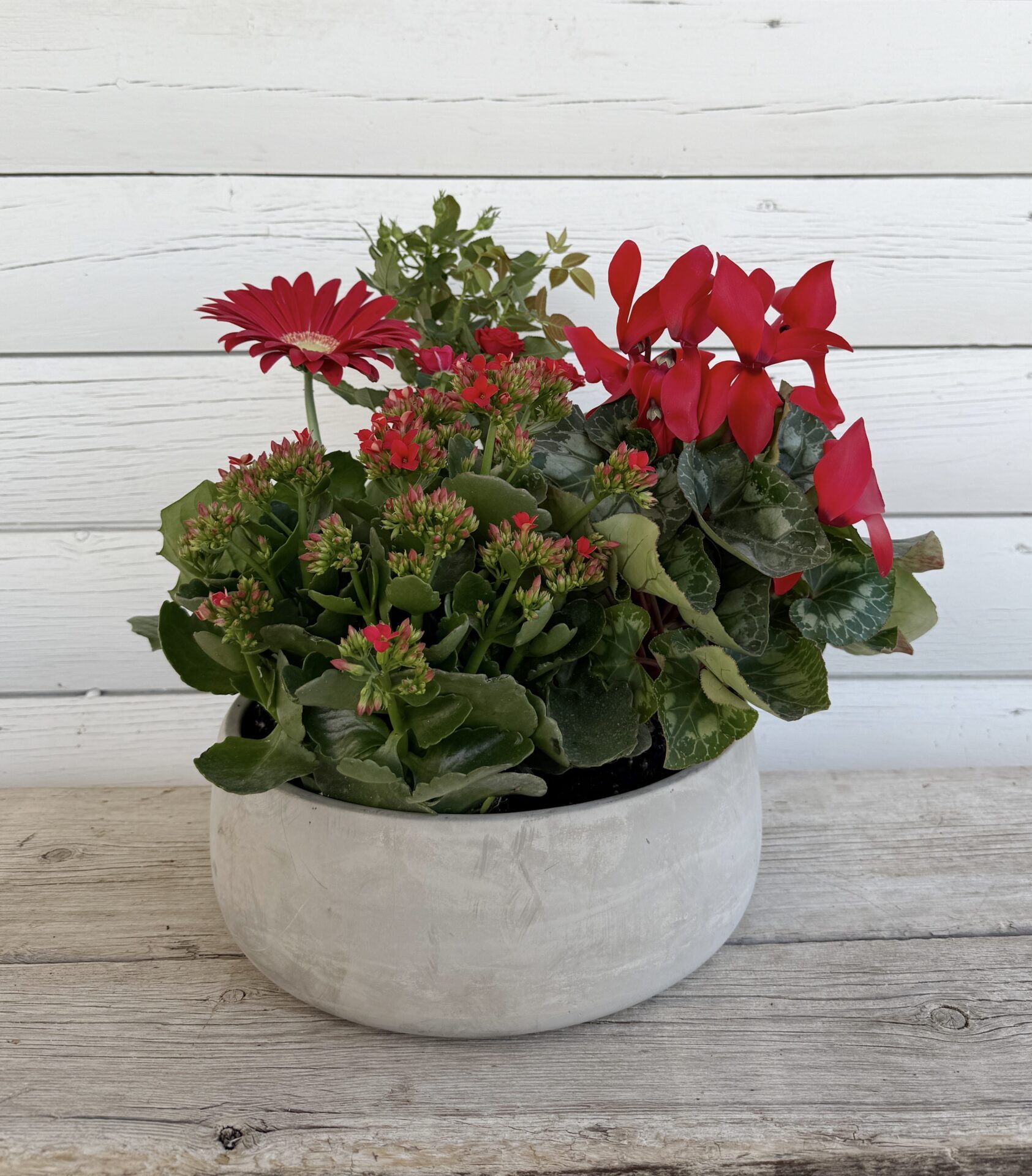 מארז עשיר וחגיגי הכולל שילוב של עציצים אדומים: גרברה, רקפת, ורדים וניצנית, שתולים יחד בתוך כלי קרמי רחב.